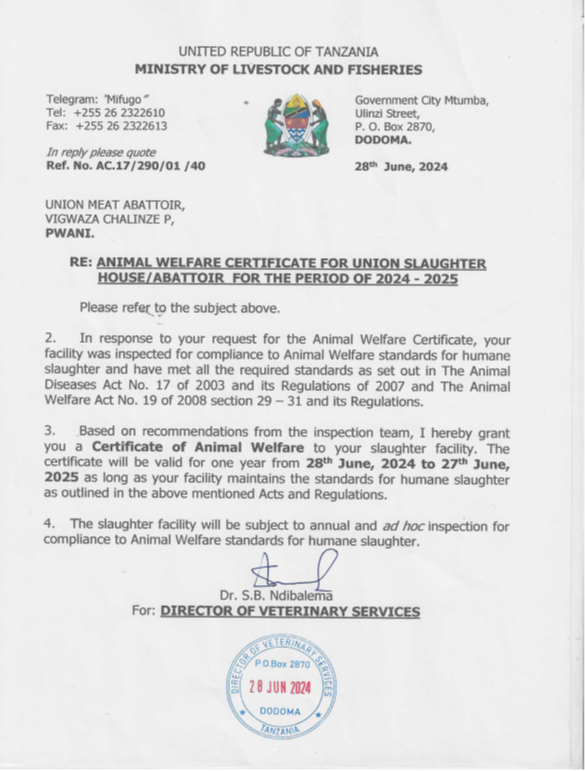 This certificate is issued by the Ministry of Livestock and Fisheries of Tanzania. It confirms that Union Meat Abattoirs complies with all required standards for humane animal slaughter as outlined in the Animal Diseases Act No. 17 of 2003 and the Animal Welfare Act No. 19 of 2008. This certification reflects the facility’s commitment to upholding the highest standards of animal welfare, ensuring that animals are treated with care, dignity, and respect throughout the slaughtering process.