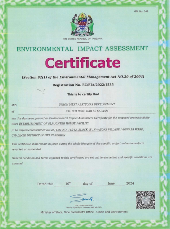 This certificate, issued by the Vice President’s Office of Tanzania, confirms that Union Meat Abattoirs has successfully completed an Environmental Impact Assessment (EIA) for the establishment of its slaughterhouse facility. It certifies that the facility operates in compliance with Section 92(1) of the Environmental Management Act No. 20 of 2004, ensuring that the abattoir’s operations are sustainable and environmentally responsible.